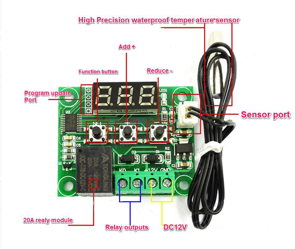 This is a high-precision temperature control module, it can not only show the temperature, but also according to the current temperature of the relay control, it can control some of the power equipment through the relay, industrial and DIY it used widely, it comes with a temperature sensor, three buttons for temperature setting and some other functional operation, three digital temperature display, and comes with a program update interface can be used to update.