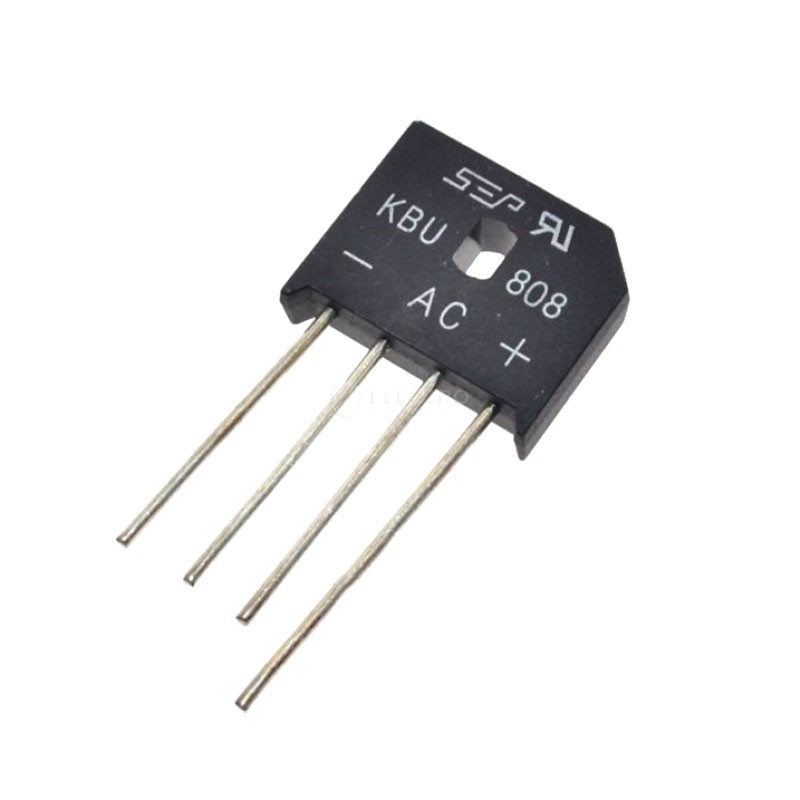 The KBU808 rectifier bridge is capable of withstanding voltage peaks of 800V and a current draw of 8A . It is an electronic circuit used to convert alternating current (AC) to direct current (DC). It is also known as a Graetz bridge. It consists of four diodes that convert a signal with positive and negative components (AC) into a purely positive signal (DC). A single diode would only retain the positive portion, but the bridge allows the negative portion to be utilized as well. The bridge, along with a capacitor and a Zener diode, enables the conversion of AC to DC.