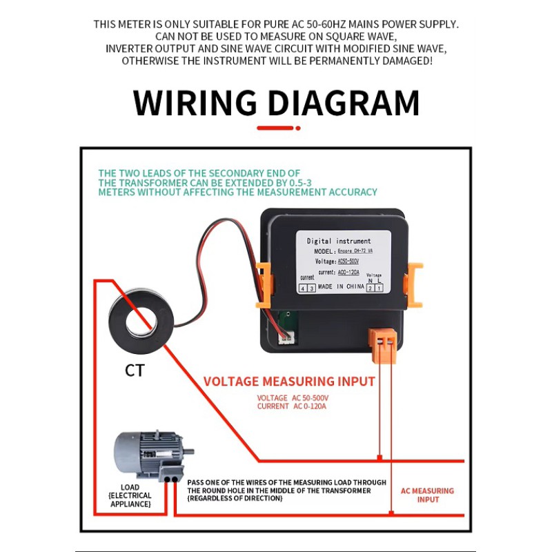 This instrument is only suitable for pure AC 50-60HZ mains power supply. It cannot be used for square wave, inverter output, and sine wave circuits with modified sine waves, otherwise the instrument will be permanently damaged!