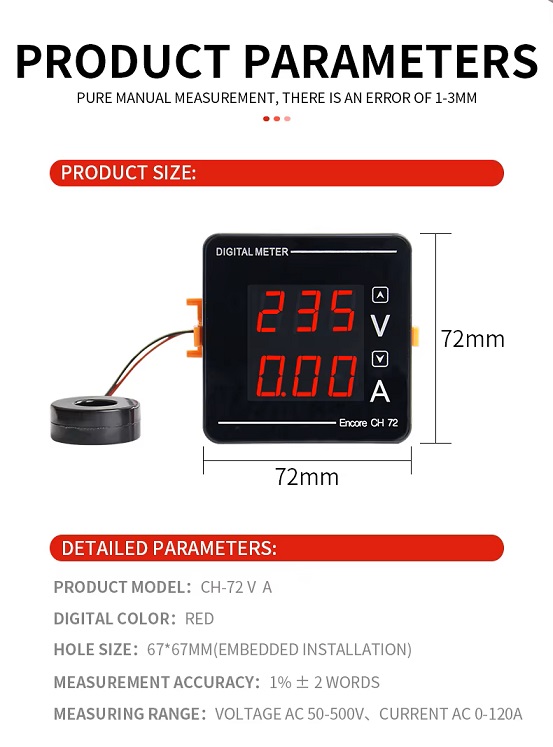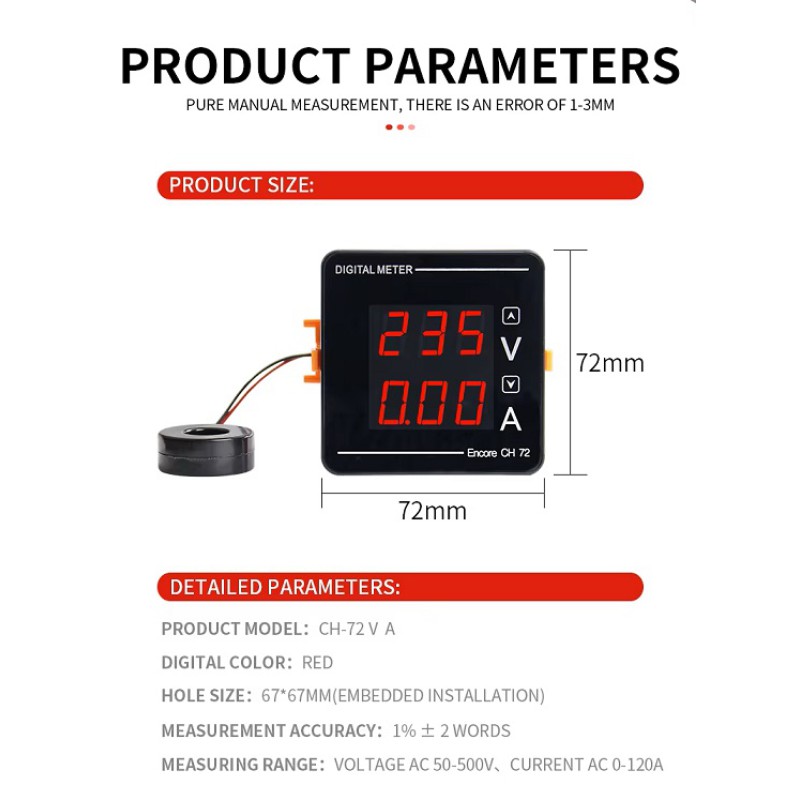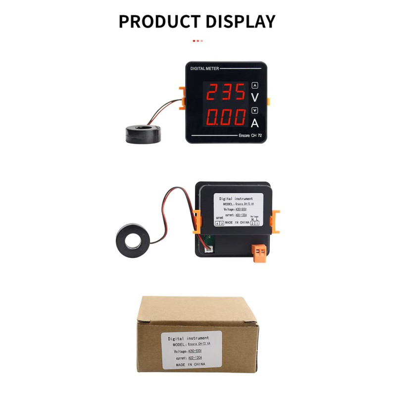The digital voltage and current dual display meter displays the measured AC voltage and current on the same meter at the same time. The meter does not need to add power supply and transformer. The meter comes with a 120A precision small transformer.
