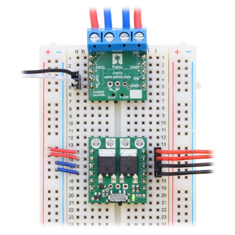 Two 6-pin straight breakaway male headers and two 2-pin 5mm terminal blocks are included with each switch, and you can choose which of these components, if any, to solder to the board. The terminal blocks work with the four large holes, and the header strips allow the switch to be used with solderless breadboards and perforated circuit boards with standard 0.1″ spacing. If you want to use the terminal blocks, we recommend you install them on the side of the board without components, as shown in the above breadboard picture. The terminal blocks will cover one of each of the smaller VIN and VOUT holes, so you should not solder header pins into those holes if you plan on using terminal blocks.