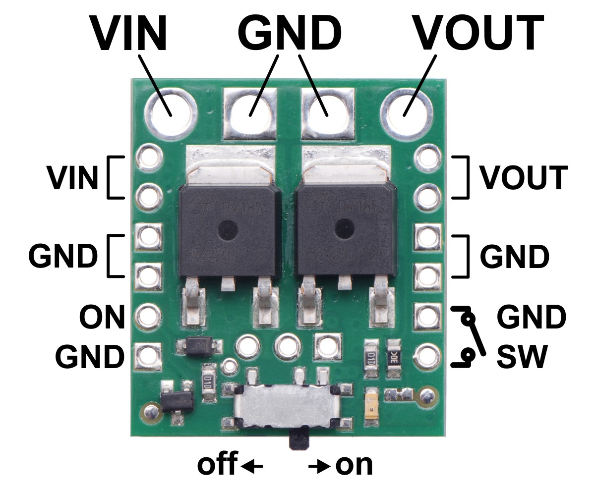 Unlike the Pololu Pushbutton Power Switches, which can lose their state when power is disconnected and reapplied, the conducting state of the MOSFET Slide Switches is determined only by the physical control switch (or a signal supplied to the “ON” pin), independent of power applied to the board. This can make them more appropriate for applications where the supplied power may be intermittent.