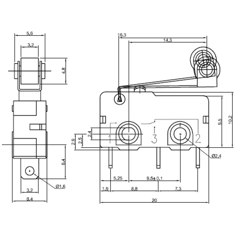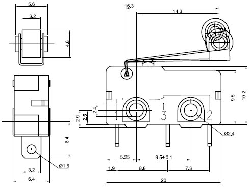 This single-pole, double-throw (SPDT) momentary switch can be used as a general-purpose micro switch or tactile obstacle-detector for your robot. The switch body dimension is 20.0 x 6.4 x 10.2 mm (0.79" x 0.25" x 0.40"), and the 16.3mm (0.64") lever arm has a roller at the tip. This three-pin switch can also be used as a two-pin single-pole, single-throw (SPST) switch that is open or closed by default, depending on which two pins are used.